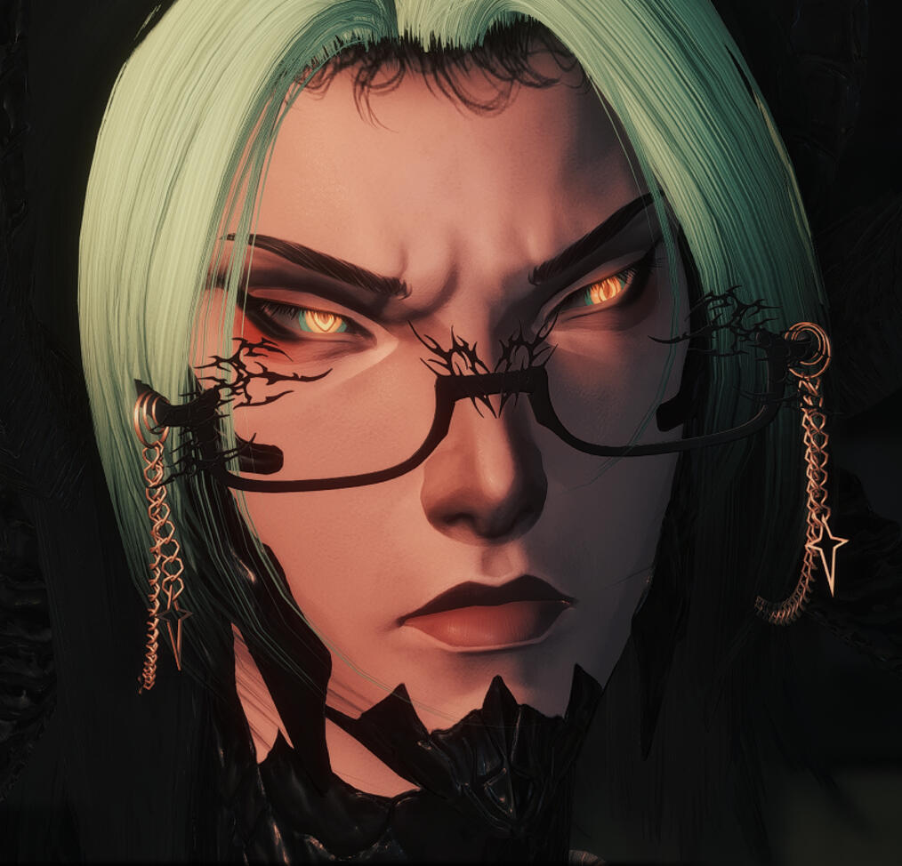 HEIGHT 7’02”HAIR dark black hair, large streaks/blocks of pale green towards the frontEYES snake-like orange eyes, with a dark green ringPIERCINGS lower horns are piercedSCARS / TATTOOS / MARKINGS