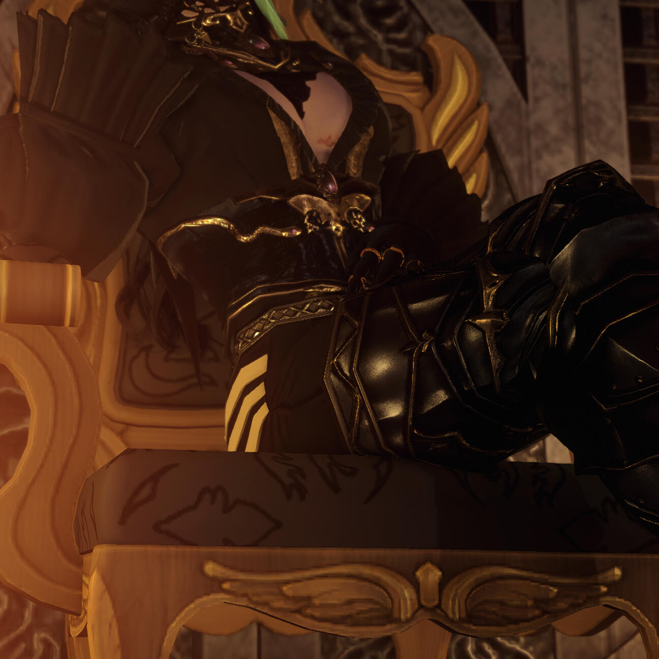 tattoos : an ishgardian cathedral from his sternum to his abdomen. a cluster of jasmine flowers with a small tanto and sheathe on his inner left thigh.